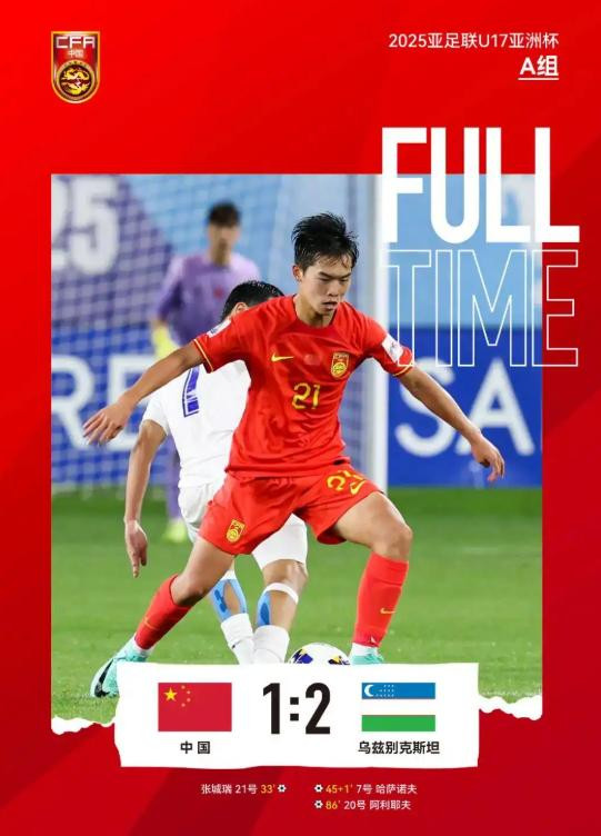 第二场比赛,中国队碰上了乌兹别克斯坦 U17 男足的挑战。在比赛第 33 分钟的时候,张城瑞在一堆人乱战中机灵地补射进球,让中国队领先了。可球迷们正盼着中国队接着赢下去的时候,场上的情况一下子就变了。上半场快结束补时的时候,乌兹别克斯坦队瞅准中国队防守松了的机会,成功把比分扳平了。到了比赛第 86 分钟,乌兹别克斯坦队发起快速反击,又把中国队球门攻破了,最后以 2 - 1 反过来赢了。