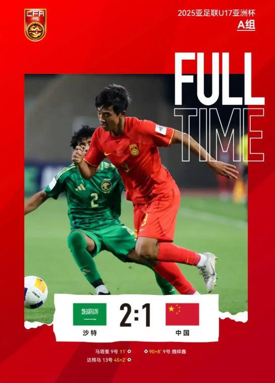 小组赛首轮,中国 U17 男足对阵东道主沙特 U17 男足。开场伊始,中国队凭借积极主动的高位逼抢策略,迅疾掌控了场上的节奏,屡次对沙特队球门构成威胁。然而,在比赛的第 22 分钟,中国队门将依合散出击时出现严重失误,致使沙特队趁机率先打破僵局。于上半场伤停补时阶段,沙特队趁中国队防守出现疏漏,再度进球。尽管中国队在比赛的第 89 分钟,由魏祥鑫觅得良机扳回一球,但最终仍以 1 - 2 憾负沙特队,错失首战告捷的机会。